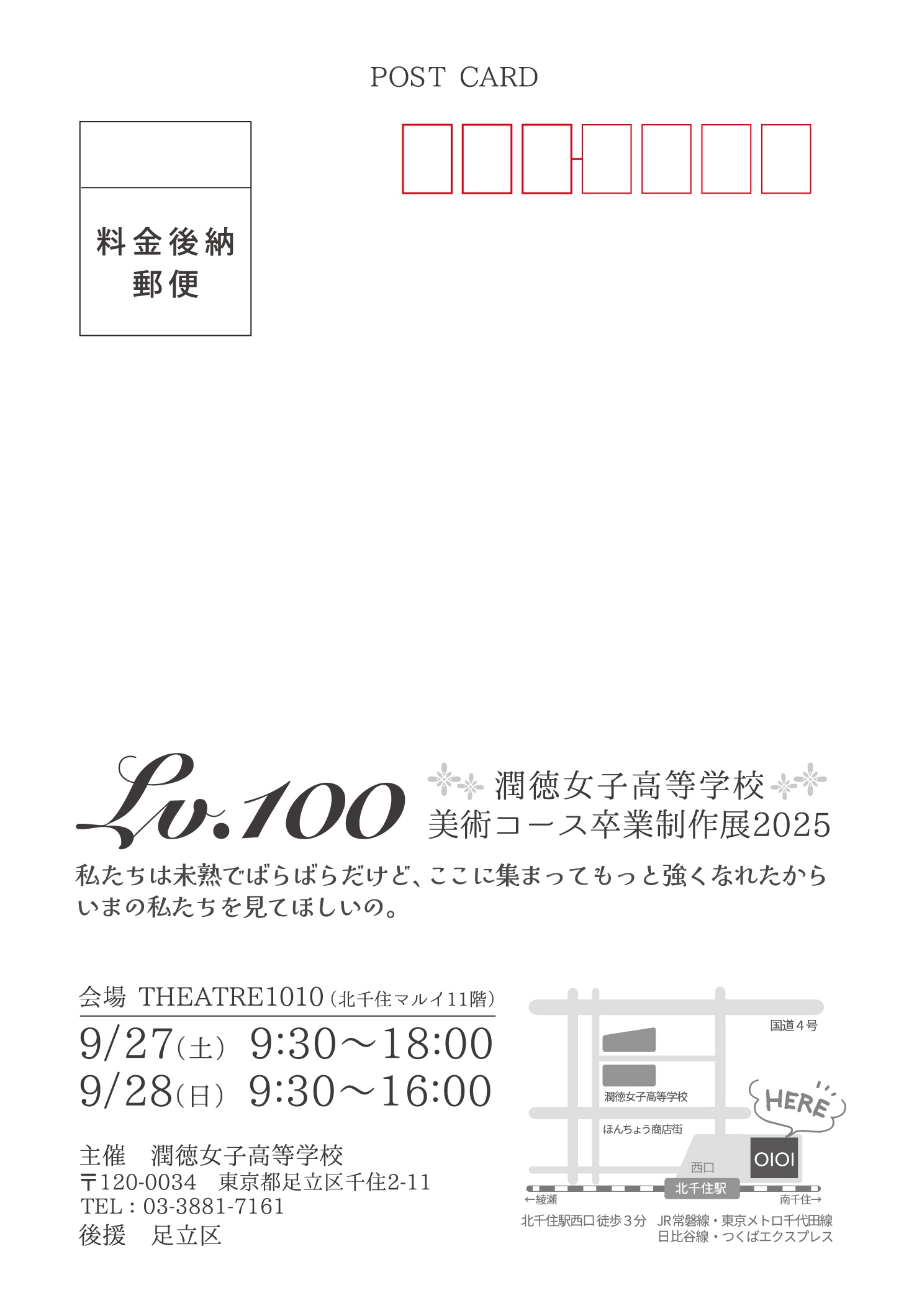 お知らせ News 美術コース卒業制作展のご案内 2025年9月27日 お知らせ 潤徳女子高等学校 美術コース 卒業展覧会 2025 のご案内 9月27日(土)・28日(日)、北千住マルイ11階 THEATRE1010 にて、 潤徳女子高等学校 美術コース 卒業展覧会 2025 を開催いたします。 今年のテーマは 『Lv.100』。 作品制作の様子や展覧会に向けた取り組みについては、 Instagram や X(旧Twitter) にて卒展広報担当の生徒が随時発信しています。 ぜひご覧ください。 皆さまのご来場を心よりお待ちしております。 「お知らせ」の最新記事 2025年10月4日10/5(日) 宿場町大道芸祭に吹奏楽部が参加!2025年9月28日出張個別相談会のご案内2025年9月27日美術コース卒業制作展のご案内2025年9月26日Instagram 記事を更新!2025年9月17日うるおい祭(キッチンカーフェス)のご案内2025年9月15日うるおい祭(クラス部門)のご案内2025年9月14日9月15日 千住神社で神楽奉納2025年6月25日ホームページをリニューアル! カテゴリー カテゴリーを選択 全ての記事 NEWS&TOPICS お知らせ 入試情報 潤徳日記 全コース 日常ブログ[特進コース] 日常ブログ[美術コース] 日常ブログ[進学コース]TOPICS説明会情報 学校説明会 学校見学会 体験入学 クラブ体験入部 個別相談会未分類