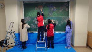 卒業生の皆さんにとって大切な一日が、より思い出深いものになるよう心を込めて制作しました。黒板いっぱいに広がる色鮮やかなアートは、卒業生への「おめでとう」の気持ちと、新しい未来へのエールを表現しています。