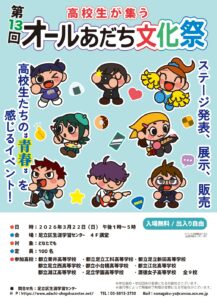 お知らせ News 高校生が集うオールあだち文化祭 参加します! 2026年3月19日 お知らせ 本校軽音楽部が、第13回オールあだち文化祭に出演いたします。 日時:3月22日(日)ステージは13時05分より開演予定です。 会場:足立区生涯学習センター 日頃の練習の成果を発揮し、部員一同、心を込めて演奏いたします。 入場は無料となっておりますので、ぜひお気軽にお越しください。 皆さまのご来場を心よりお待ちしております。 ↓クリックすると拡大します 「お知らせ」の最新記事 2026年3月19日高校生が集うオールあだち文化祭 参加します!2026年3月16日中学校2年生が上級学校訪問で来校しました2026年3月12日感謝状をいただきました!2026年3月10日合格者のみなさまへ2026年3月7日Instagram 記事を更新!2026年2月17日新入生へお知らせ入学式のご案内2026年1月29日写真部 関東大会へ選出!2025年11月14日地域連携 足立成和信用金庫 キャラクターデザイン2025年10月4日10/5(日) 宿場町大道芸祭に吹奏楽部が参加!2025年9月28日出張個別相談会のご案内 カテゴリー カテゴリーを選択 教員採用情報全ての記事 NEWS&TOPICS お知らせ 潤徳日記 全コース 日常ブログ[特進コース] 日常ブログ[美術コース] 日常ブログ[進学コース]TOPICS説明会情報 学校説明会 学校見学会 体験入学 クラブ体験入部 個別相談会未分類