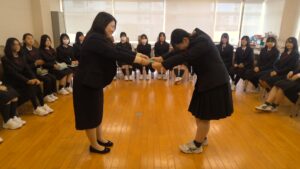 全員の自己紹介が終わった後、先輩から新入生に対してお菓子のプレゼントがあり、歓迎の挨拶がおこなわれました。学園生活や行事の魅力などを、新入生に対して丁寧に述べてくれました。
